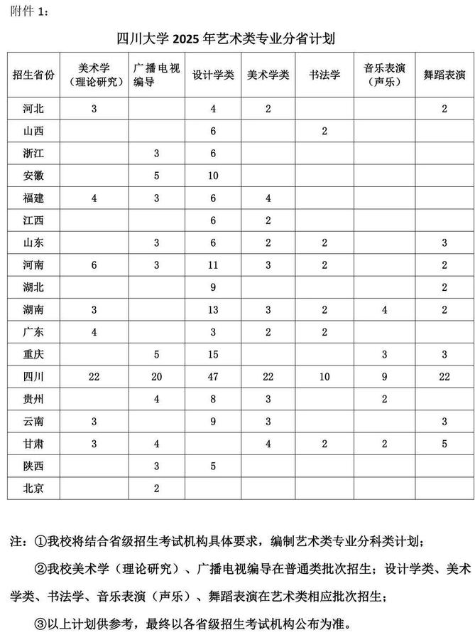 2.四川大学2025年艺术类专业分省计划见附件1。